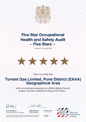 We are thrilled to announce that Torrent Gas Limited, Pune District GA (EAAA) has been awarded a “Five- Star Occupational Health and Safety Audit – Five Stars” by British Safety Council.